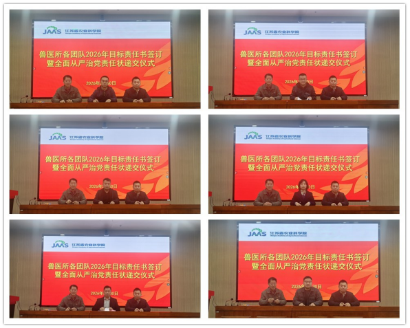 兽医所所长李彬指出2026年十五五的开局之年,也是兽医所攻坚克难、提质增效的关键一年,业绩目标任务书是对全所科研、服务、管理等核心业务的量化承诺,而从严治党责任状则是营造风清气正政治生态的底线要求。他强调,全体职工要以签约为起点,锚定目标不松懈,围绕年度重点任务,细化举措、攻坚克难,确保各项指标圆满完成。