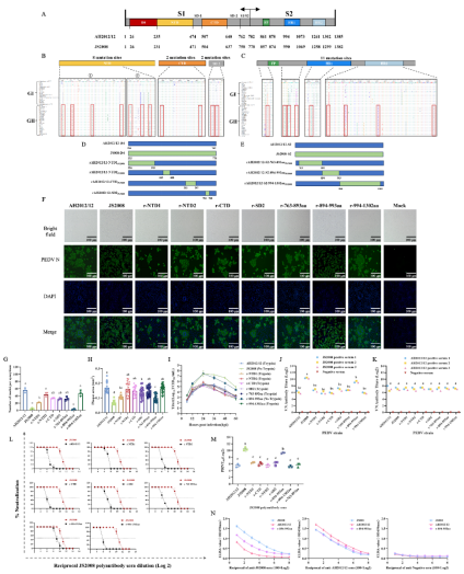 猪流行性腹泻(PED)作为一种急性、高度接触性肠道传染病,由猪流行性腹泻病毒(PEDV)引起,常导致仔猪严重腹泻和高死亡率。自20世纪70年代首次报道以来,该病已在全球范围内广泛流行。2010年后,高致病性PEDV变异株在全球迅速暴发,造成数百万头仔猪死亡,给全球养猪业带来了巨大经济损失。疫苗免疫是防控PEDV的核心手段,但临床上广泛使用的基于GⅠ型经典株开发的疫苗对近年来流行的GⅡ型变异株保护效果十分有限,已免疫疫苗的猪场经常出现突破性感染。这一现象提示,PEDV变异株可以逃逸经典毒株疫苗诱导的免疫保护,但其分子机制仍有待深入解析。